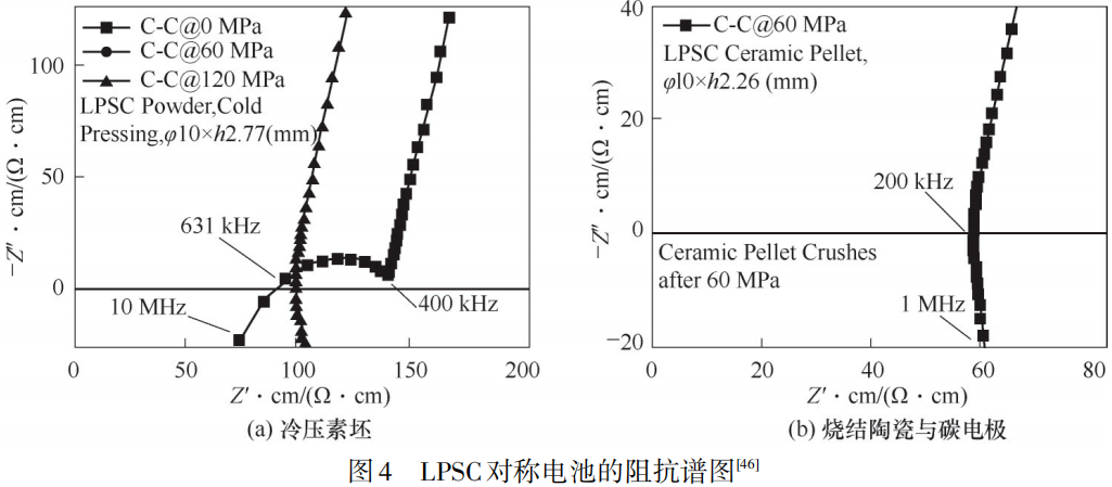 陶瓷电解质与电极之间的界面为固-固界面,压力对陶瓷电解质界面电阻的影响更为显著,对体相电阻的影响与电解质的材料硬度有直接关系。由于硫化物电解质相对质软,杨氏模量为18~25GPa,制备过程中压力会影响电解质的密度和孔隙率等性质,进一步影响电解质的离子电导率。Doux等研究了不同制备压力对LPSC电解质性能的影响。当制备压力由50MPa增加至250MPa时,电解质相对密度由68.3%提高至75.4%,离子电导率由0.99×10-3S/cm增加至2.06×10-3S/cm。进一步提升制备压力至370MPa,离子电导率增加至2.28×10-3S/cm,增速减缓。黄晓等介绍了硫化物固态电解质在不同压力下的离子电导率。如图4所示,LPSC冷压素坯(粉体冷压成片)在120MPa和60MPa压力下阻抗谱为一条跨越Z′轴的曲线,离子电导率为 1.09×10-2S/cm。撤掉压力后,阻抗曲线具有容抗半圆,离子电导率降为7.5×10-3S/cm。将冷压片坯烧结为陶瓷,并施加60MPa压力,离子电导率可以达到1.72×10-2S/cm,压力继续增加容易造成陶瓷片碎裂。