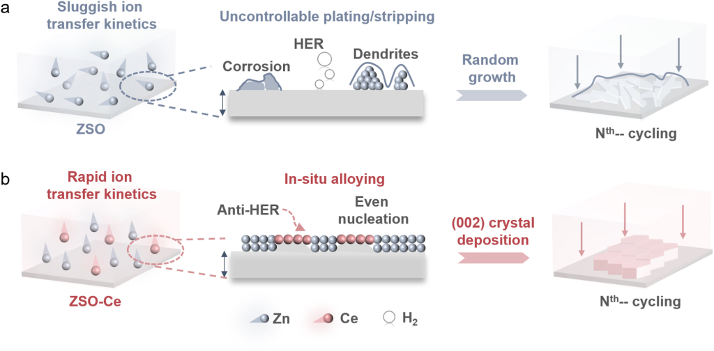 图1.不同电解液中Zn电沉积行为示意图。(a)ZSO电解液。(b)ZSO-Ce 电解液。