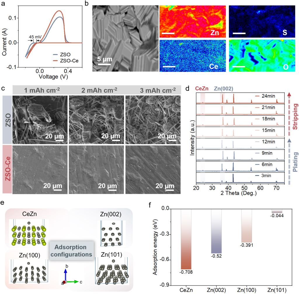 图2.Zn沉积行为研究。(a)1mVs−1时Zn||Cu非对称电池的典型CV曲线。(b)在5mAcm−2的电流密度下沉积后,对Zn//Cu电池中的Cu阴极进行的EMPA测试。(c)不同电解质中Zn沉积的SEM图。(d)ZSO-Ce电解质中负极的非原位XRD图。循环后Zn负极中(e)Zn元素和(f)Ce元素的XPS分析的深度蚀刻轮廓。(g)Zn原子在ZnCe和不同Zn晶体上的吸附能。