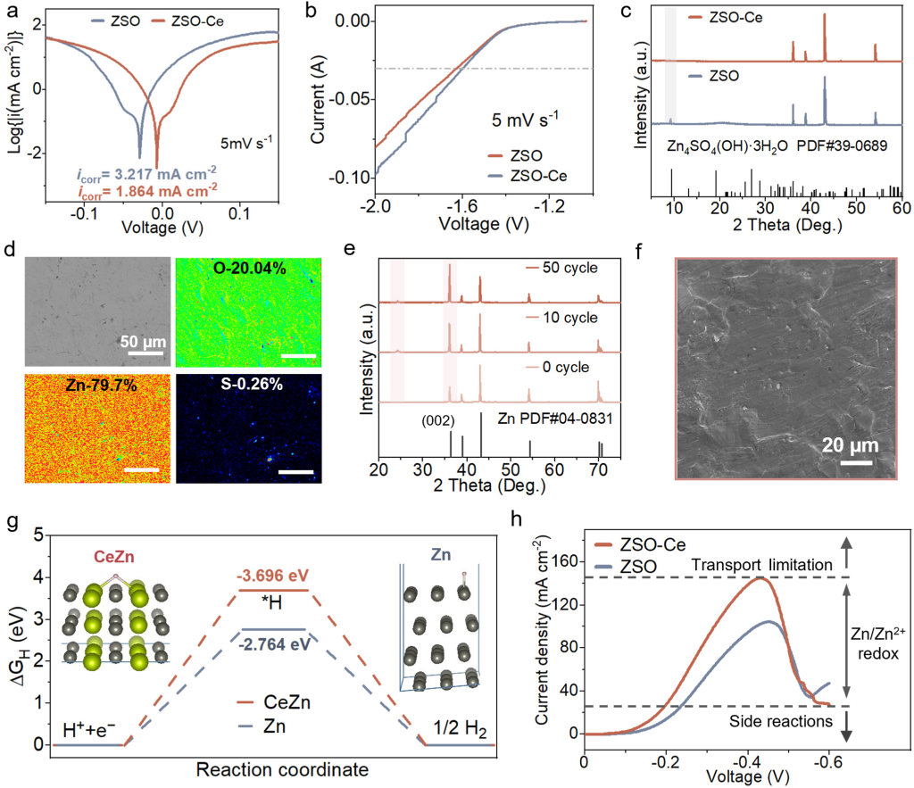 图3.抑制副反应。(a)不同电解液中的塔菲尔图。(b)不同电解液中的LSV曲线。(c)在ZSO和ZSO-Ce电解液中浸泡7天后的Zn负极的XRD图。(d)在ZSO-Ce电解液中浸泡后的负极表面的EPMA元素映射。(e)在ZSO-Ce电解液中循环后的Zn负极的非原位XRD。(f)在ZSO-Ce电解液中循环50次后Zn负极的相应SEM图。(g)DFT计算以研究HER的ΔGH。(h)不同电解液中Zn//Zn对称电池的LSV测试。