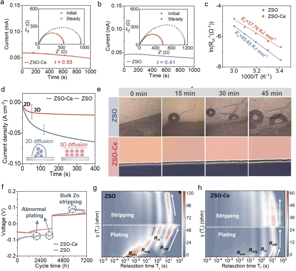 图4.成核/生长研究。(a)ZSO-Ce电解质中的Zn2+迁移数。(b)阿伦尼乌斯曲线和活化能比较。(c)−150mV下Zn//Zn对称电池的CA曲线。(d)Zn原子在CeZn和Zn表面扩散的能量分布。(e)不同电解液中Zn电沉积的原位光学照片。(f)原位EIS测试期间对称电池的GCD曲线。(g)ZSO 电解液中相应的弛豫时间(DRT)分布。(h)ZSO-Ce 电解液中相应的弛豫时间(DRT)分布。