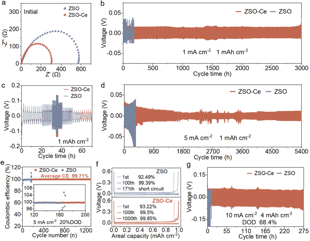 水系锌离子电池(AZIB)因其高安全性和低成本而成为一种极具前景的储能技术。然而,不稳定的锌负极严重阻碍了AZIB的实际应用,尤其是在高放电深度(DOD)下。本研究提出了一种基于Ce3+添加剂的原位界面合金化工程来调控锌的沉积行为,显著提高了锌负极的循环稳定性和可逆性。Ce3+在锌负极界面原位形成ZnCe合金,诱导致密的Zn(002)晶面优先沉积,有效缓解浓差极化。采用Ce3+电解液的Zn//Zn对称电池在1mAcm−2下实现了3000小时的稳定循环,并在5mAcm−2的高电流密度下实现了27Ahcm−2(5400小时)的累积容量。即使在68.4%的高放电深度下,也能保持420小时的稳定循环。正负极容量(N/P)比低至4.30,正极负载量高至10mgcm−2的全电池,在2Ag−1的电流密度下,可稳定循环超过1000次。此外,N/P比为4.68的80mAh级软包电池在100次循环后仍保留85%的容量。本文为实用化AZIB的界面工程提供了新的见解。