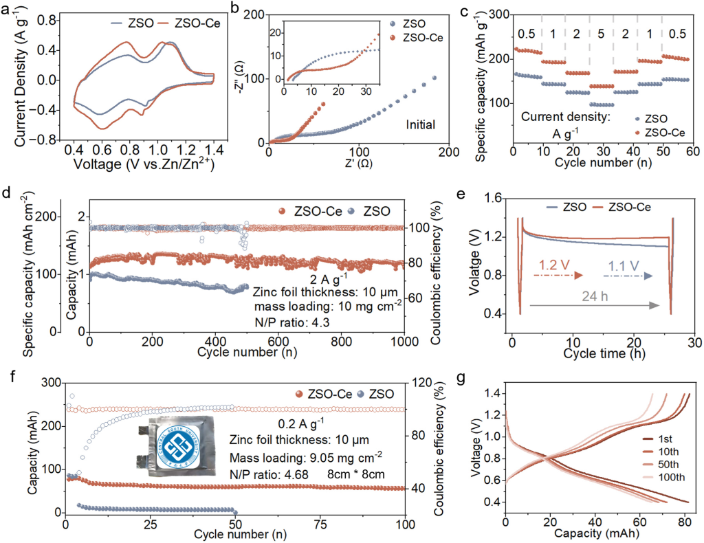图6.高NVO负载量、高稳定性Zn//NVO电池。(a)扫描速率为0.1mVs−1时全电池的CV曲线。(b)全电池的EIS图。(c)全电池从0.2到5Ag−1的倍率性能。(d)NVO负载量为10mgcm−2的Zn//NVO纽扣型全电池在2Ag−1时的长期循环稳定性。(e)Zn//NVO全电池的自放电测试。(f)软包电池在0.2Ag−1下的循环性能。(g)与其他报道的电池的N/P比和循环性能比较。