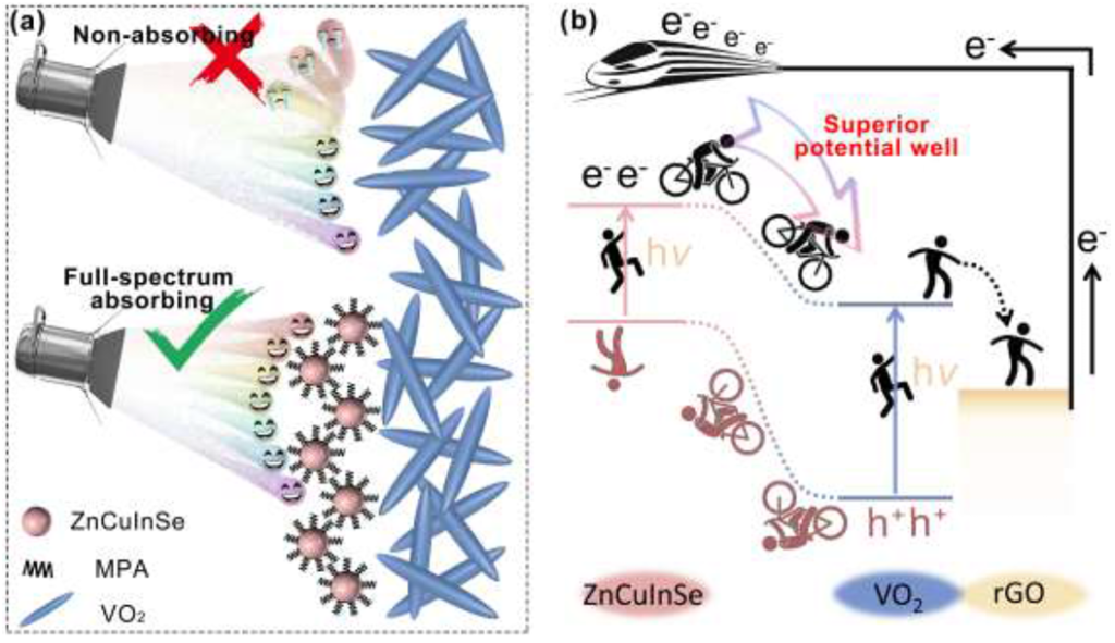 图 1. (a) VO2 和 QDVO 基正极之间的光吸收比较和 (b) 光辅助载流子动力学。