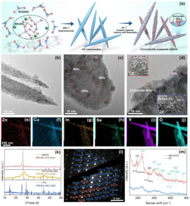 图2.(a)纯VO2纳米针和玉米芯状QDVO复合材料的制备;(b-c)QDVO的TEM图;(d)QDVO的HRTEM图(插图);(e-j)QDVO复合材料中元素的映射;(k)QDVO、ZnCuInSeQDs和VO2的XRD;(l)QDVO的SAED;(m)QDVO的拉曼。