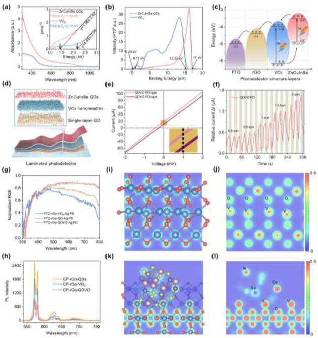 图3.(a)VO2和ZnCuInSeQDs的紫外可见吸收光谱和Tauc曲线(插图);(b)VO2和ZnCuInSeQDs的UPS曲线;(c)基于FTO/rGO/QDVO的层状PD的内部载流子动力学;(d)应用层状PD的层次结构图;(e)基于QDVO的层状PD的IV曲线;(f)基于QDVO的层状PD的电流-时间曲线;(g)QDVO、ZnCuInSeQDs和VO2的归一化EQE曲线;(h)CP-rGo-QDVO、CP-rGo-VO2和CP-rGo-ZnCuInSe的PL光谱;(i、j)光照下VO2的电荷密度拟合图;(k,l)光照下QDVO电荷密度拟合图。
