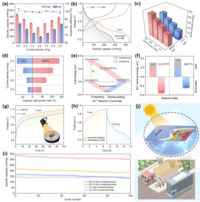 图4.(a)基于QDVO的光致ZIBs在明/暗条件下的倍率容量曲线;(b)基于QDVO的光致ZIBs在200mA/g电流密度下在明/暗条件下的恒流充放电曲线;(c)光照下QDVO和VO2基光致ZIBs的容量比性能对比;(d)不同电流密度下QDVO和VO2基光致ZIBs的比容量光增长率对比;(e)明/暗条件下QDVO充放电过程中Gibbs自由能的变化;(f)明暗条件下QDVO和VO2的Zn2+脱嵌能;(g)QDVO和VO2基光致ZIBs的纯光充电性能;(h)QDVO基光致ZIBs的纯光充电-暗放电曲线;(i)QDVO和VO2基光子电池在500mA/g下的明/暗100圈恒流充放电性能;(j)光子电池在未来电动公共交通中的光充电应用。