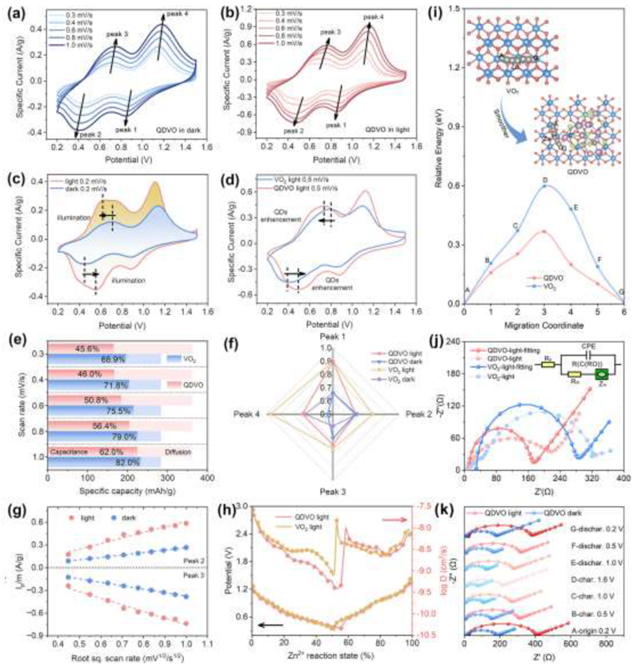 图5.(a)一系列扫描速率下QDVO基photo-ZIB的暗CV曲线和(b)亮CV曲线;(c)0.2mV/s下QDVO基photo-ZIB的明/暗CV曲线比较;(d)0.5mV/s下QDVO和VO2基photo-ZIB的明/暗CV曲线比较;(e)光照下QDVO和VO2基photo-ZIB的电容和扩散贡献比;(f)QDVO和VO2基photo-ZIB的明/暗CV曲线中四个REDOX峰的b值分布;(g)光照和暗条件下QDVO基photo-ZIB的扩散系数;(h)光照下QDVO和VO2基photo-ZIB的GITT曲线;(i)VO2和QDVO中Zn2+的迁移路径和迁移势垒;(j)基于VO2和QDVO的光ZIBs的光EIS拟合曲线和源数据曲线;(k)基于QDVO正极的光ZIBs在光照和暗条件下充放电过程中的非原位EIS拟合曲线。