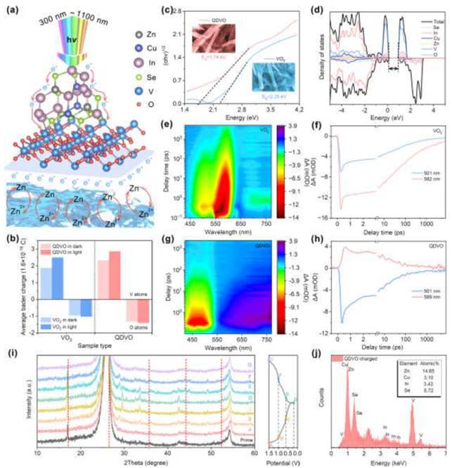图6.(a)QDVO复合材料的光电子动力学和键合结构;(b)光照和黑暗条件下QDVO和VO2中V和O原子的平均Bader电荷;(c)QDVO和VO2的光学带隙表征;(d)QDVO的态密度分析;(e,g)使用360nm激光对QDVO和VO2进行的伪彩色TA图;(f,h)QDVO和VO2在特定波长下的TA光谱;(i)基于QDVO的光-ZIB在充放电过程中在不同电位下的原位XRD和(j)基于QDVO的阴极经过多次充放电循环后的EDS。