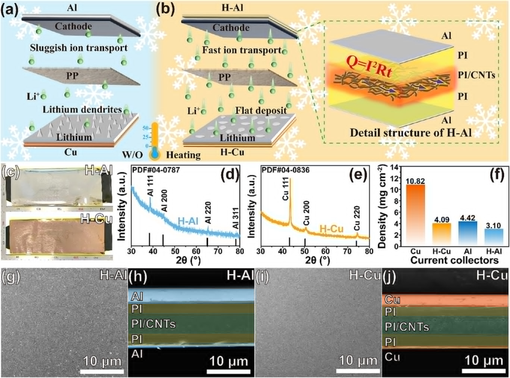 图1.使用a)商用CC和b)可加热复合CC设计的电池中锂离子传输和锂沉积的示意图。c)获得的大尺寸(30厘米×10厘米)H─Al和H─CuCC的数码照片。d)H─Al和e)H─CuCC的XRD。f)Cu、H─Cu、Al和H─AlCC的密度比较。g)H─Al和i)H─CuCC的表面SEM图。h)H─Al和j)H─CuCC的横截面SEM图。