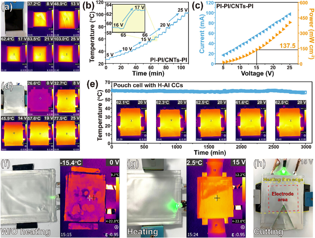 图2. a)红外相机图像和b)可加热PI/CNTs薄膜在不同施加电压下的温度分布。c)PI/CNTs薄膜在0至25V电压范围内的加热电流和相应的功耗。d)不同电压下采用H─AlCC的电池的温度分布。e)采用H─AlCC的电池的稳定性和红外相机图像。在低于−22°C的温度下使用H─AlCC的电池的数码照片和红外相机图像f)无加热电流,和g)有加热电流。h)切割测试后采用H─AlCC组装的软包电池的数码照片。