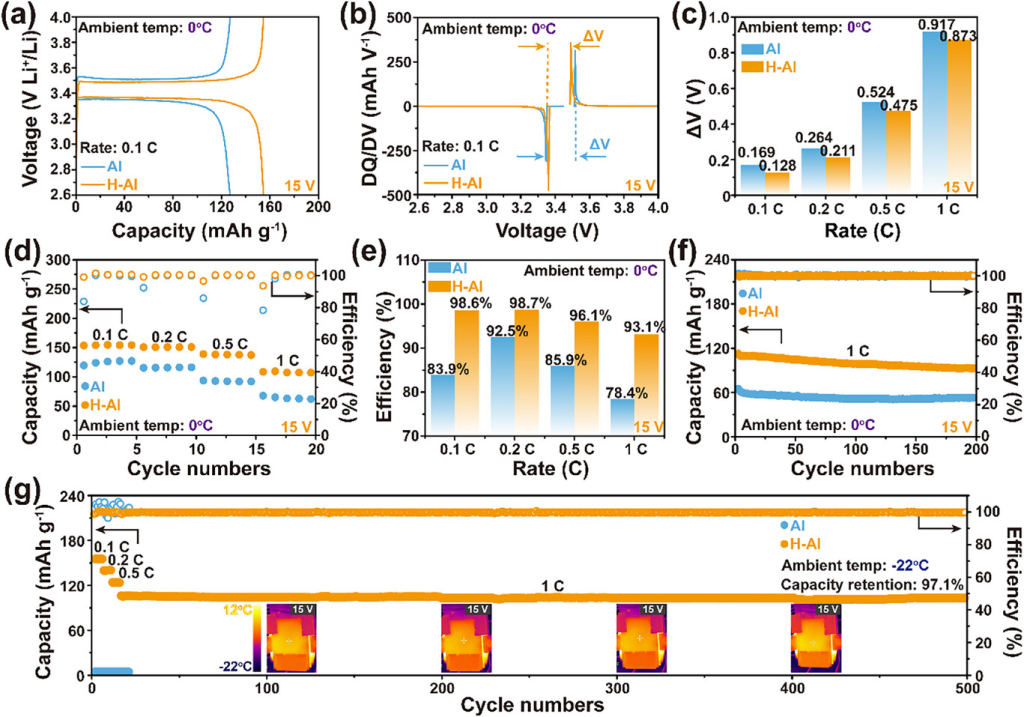 图3. a)充放电曲线,b)DQ/DV曲线,c)使用Al和H─AlCC的软包电池对应的ΔV。d)倍率性能,e)使用Al和H─AlCC的软包电池在0.1至1C范围内对应的首次效率。f)0°C和g)−22°C条件下,使用Al和H─AlCC的软包电池的长期循环稳定性。