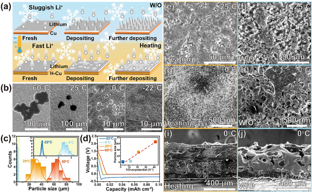 图4. a)提出的锂核生成和生长机制示意图。b)SEM图和c)相应的锂颗粒在不同温度下的尺寸分布直方图,容量限制为0.1mAhcm−2。d)在0.05mAcm−2电流密度下,不同温度下锂电沉积过程的计时电流比较。插图显示了原子核尺寸与电化学过电位之间的关系。e)在25°C下加热和f)未加热后,在1C下循环100次后锂金属表面的表面SEM图像。g-i)在0°C下加热和h-j)未加热后,在1C下循环200次后锂金属表面的表面和横截面SEM图。