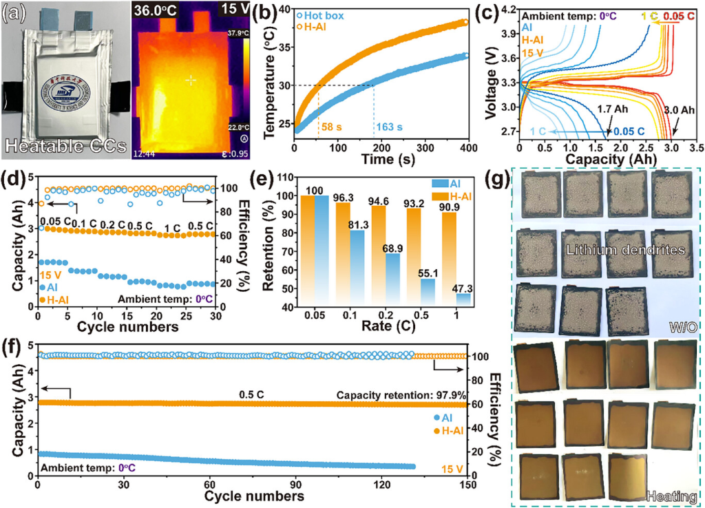 图5. a)使用可加热CC的3Ah软包电池的数码照片和红外相机图像。b)比较具有可加热CC的电池和热箱中的电池的加热速率。c)使用Al和H─AlCC在0°C下对3Ah软包电池进行的充放电曲线、d)倍率性能和e)相应的容量保持率(从0.05到1C)。f)使用Al和H─AlCC在0°C下对3Ah软包电池进行的长期循环稳定性比较。g)使用Al和H─AlCC在0°C下对循环电池的满充电负极电极进行的数码照片。