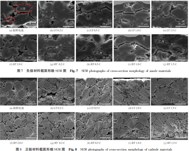 为深入研究不同温度和倍率对电池老化的影响,并探讨导致不同条件下老化差异的底层机制,对电池进行拆解,通过SEM观察电极的形貌变化。新鲜电池与循环老化电池的负极、正极截面形貌SEM图分别见图7、图8。