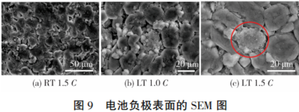 从图9可知,低温老化后,电池负极表面出现了大量苔藓状物质,部分石墨颗粒表面变得粗糙且不均匀,并伴有沉积物的生成。