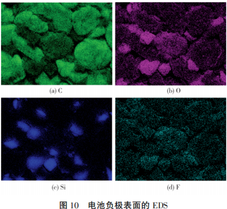 从图10(a)可知,标注区域的整体亮度较低,粒子数量较少,说明颗粒可能不再是石墨,而是某些含碳化合物。从图10(c)可知,标注区域内几乎没有信号响应,可以确认此处不是含硅物质表面。从图10(b)、(d)可知,标注区域内存在氧和氟的信号,说明此处存在电极氧化与电池电解液分解的迹象。从实验结果可以确定,在低温循环老化过程中,负极表面存在析锂现象。