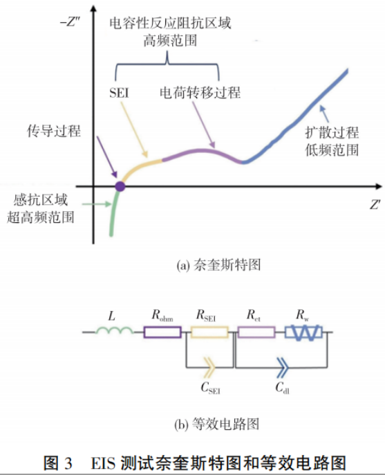 等效电路模型(ECM)将EIS测试的奈奎斯特图精确划分为几个与不同退化模式相关的区域。监测这些区域的阻抗变化,可识别和量化电池内部在老化过程中的变化。欧姆阻抗Rohm的变化常常能反映电解质的退化,增加通常归因于导电性损失(CL),第一个由电阻-电容(RC)元件建模的半圆弧与SEI膜相关,SEI膜阻抗RSEI的增加代表SEI膜的增长,通常归因于LLI;中低频区域电荷转移阻抗Rct和扩散阻抗Rw的变化主要来自LAM。