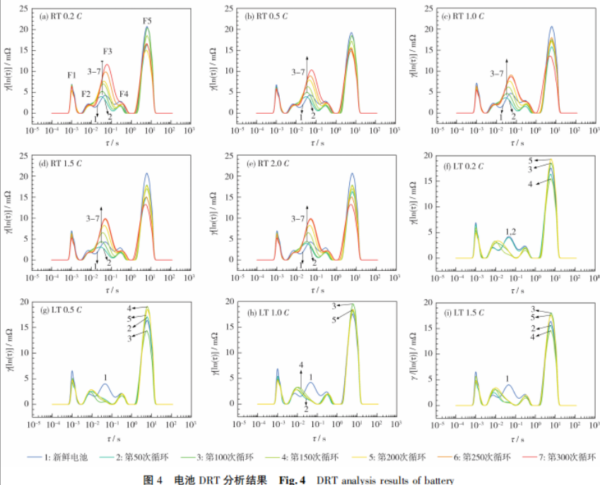 电池在SOC=0状态时,常温循环老化条件下,DRT分析结果见图4(a) -(e);低温循环老化条件下,DRT分析结果见图4(f)-(i)。