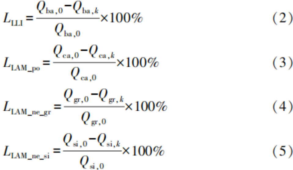 根据式(2)-(5)以及图5,计算得出各老化路径在老化过程中的占比。电池负极石墨组分的LAM占比见图6(a);电池负极硅氧化物组分LAM的演变规律见图6(b);电池正极的老化情况图6(c);LLI损失情况见图6(d)。从图6(a)可知,在常温条件下,负极石墨材料的LAM速度略快于低温同倍率下,并呈现出LAM与充电倍率正相关的特性。