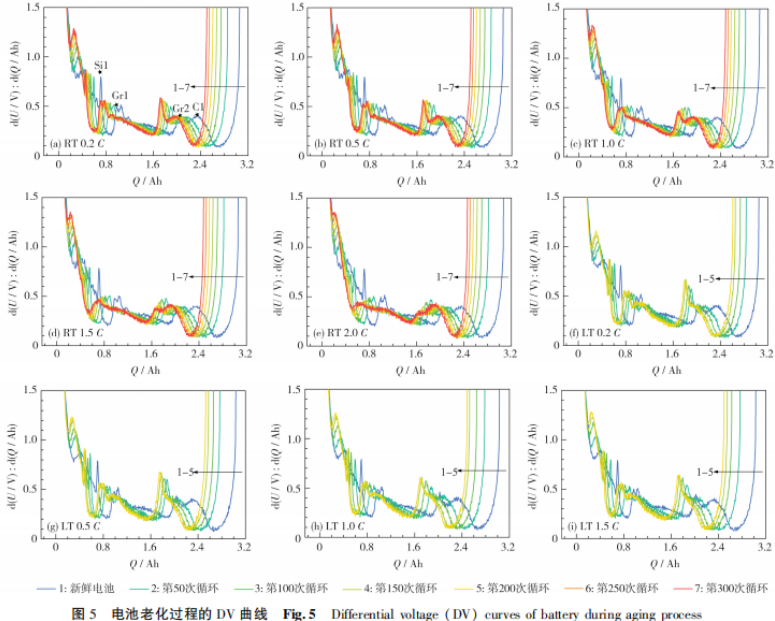 DV曲线按容量从小到大的方向,前两个峰由硅氧化物材料脱锂相变引起。对于新鲜电池,从0Ah到第2个硅峰(约0.7Ah)之间的距离代表硅的存储能力,称为Qsi,该特征峰可记为Si1。从约1.0Ah到约2.1Ah的两个主要石墨峰为石墨的存储能力,称为Qgr,两个特征峰依次记为Gr1和Gr2。约2.3Ah处的峰由正极引起,该峰与总容量的差值称为Qca,该特征峰可记为C1。Gr2与总容量的差值称为Qba,可以解释为由于老化导致的正、负极之间电极平衡位置的变化,Qba的变化,代表着电池活性Li+物质的损失。