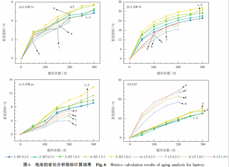从图6(c)可知,常温条件下,电池正极的老化速率快于低温条件下的,同时正极LAM随倍率升高而加剧。在整个老化周期中,正极的老化速率趋于匀速,较为稳定。通过正负极的LAM分析发现,与负极石墨相比,正极LAM更明显。此外,微观测试分析显示,正极颗粒发生了明显的破损,而负极石墨颗粒的破碎现象相对较轻。