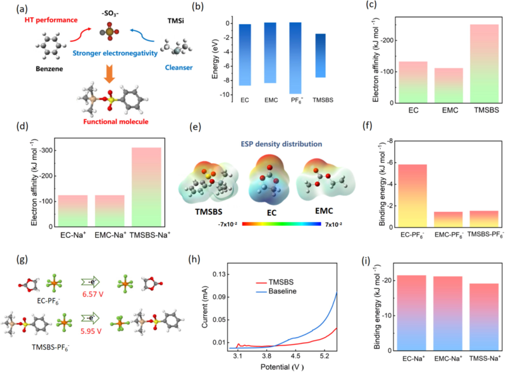 图1. (a)功能添加剂的设计思路。(b)EC、EMC和PF6−的HOMO和LUMO能级。(c)EC、EMC、TMSBS和(d)EC-Na+、EMC-Na+、TMSBS-Na+的电子亲和能。(e)EC、EMC和TMSBS的ESP密度分布。(f)EC-PF6−、EMC-PF6−和TMSBS-PF6−团簇的结合能。(g)EC-PF6−和TMSBS-PF6−团簇的计算氧化电位。(h)不同电解质的LSV曲线。(i)EC-Na+、EMC-Na+和TMSBS-Na+团簇的结合能。