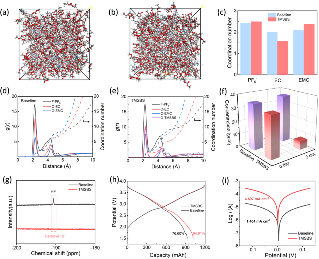 图2. MD的(a)基准电解液和(b)TMSBS电解液的计算模型。(c)不同电解液中Na+的配位数。(d)基准电解液和(e)TMSBS电解液的径向分布函数。(f)不同电解液储存3天前后的水分含量。(g)不同电解液储存7天后的NMRF1s谱。(h)不同电解液电池的首次循环库仑效率。(i)塔菲尔图上的电解液交换密度。