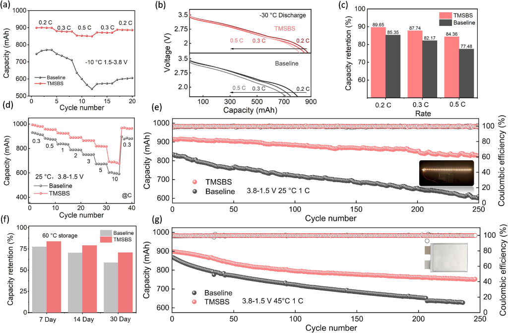 图3. (a)不同电解液的软包NFM/HC电池在−10℃时的倍率性能和(b、c)−30℃时的低温放电性能。(d)25℃下含/不含TMSBS的软包电池的倍率性能和(e)循环性能。(e)图示为软包电池在黑暗中作为电源使LED灯发光。(f)电池在60℃高温储存不同天数后的容量保持率。(g)45℃下含/不含TMSBS的软包电池的倍率性能和循环性能,图示为软包电池的模型。