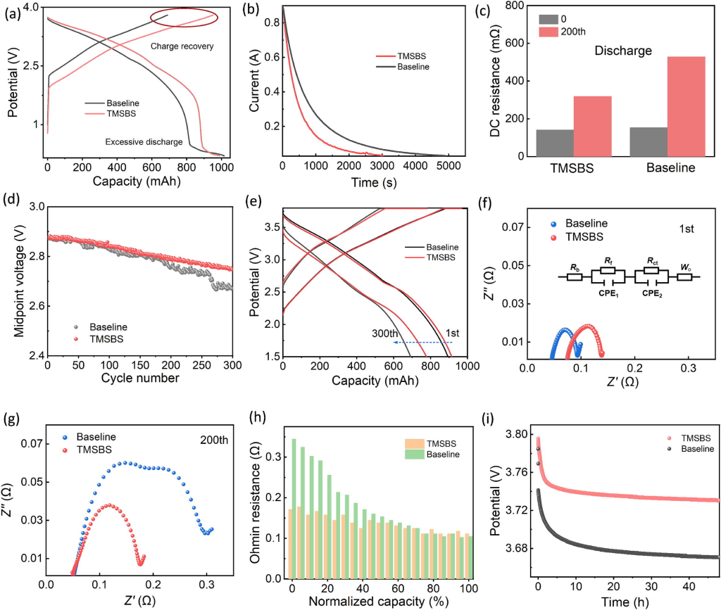 图4. (a)电池在放电和恢复过程中的容量-电压曲线。(b)达到截止电压后的电流随时间的变化图。(c)电池在不同电解质循环前后的直流电阻。(d)电池在不同电解质循环过程中的中点电压和(e)容量-电压曲线。(f)初始和(g)25°C下第200次循环后的EIS。(h)不同标准化容量下含/不含TMSBS的电池的欧姆电阻。(i)闲置后软包电池的电压降。