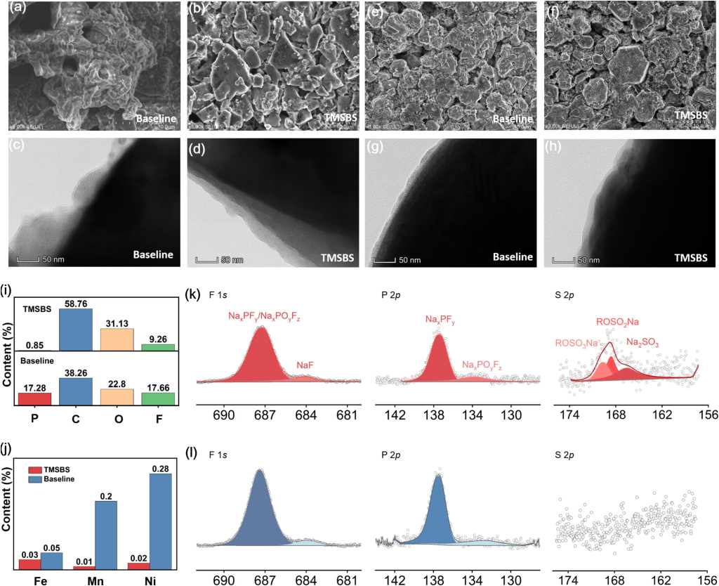 图5. (a和b)分别为循环HC负极的基准电解质和含TMSBS电解质的SEM图和(c和d)TEM图。(e和f)分别为循环NFM正极的基准和含TMSBS电解质的SEM图和(g和h)TEM图。(i)不同电解质循环后HC电极的EDS结果。(j)通过ICP-OES测定不同电解质中正极溶解的过渡金属离子含量。(k)含TMSBS电解质和(l)循环HC负极基准的XPS。