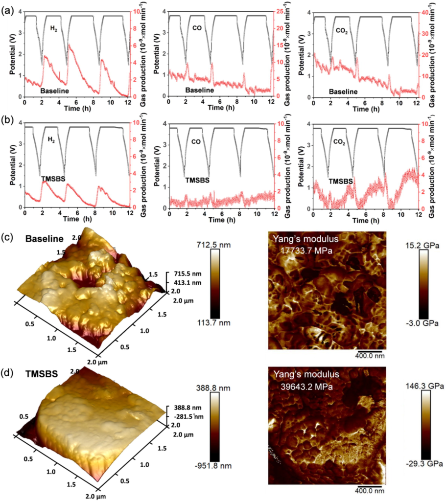 图6. 软包电池在45°C下循环时产生的H2、CO和CO2的DEMS结果,分别采用(a)基准电解液和(b)含TMSBS的电解液。(c)基准电解液和(d)TMSBS正极的AFM表征图和表面轮廓图。