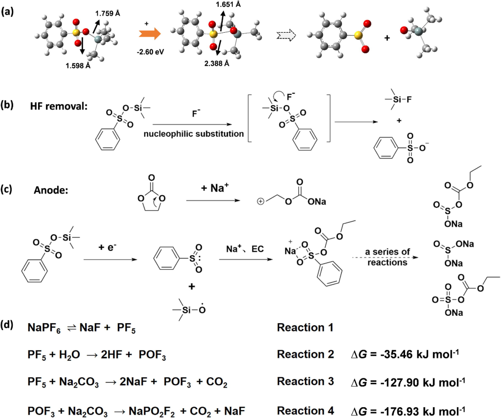 图7.(a)TMSBS分子获得电子后原子间键长的变化;(b)TMSBS分子与氢氟酸的反应过程;(c)TMSBS在正极/负极上的分解反应;(d)气体产生机理分析。