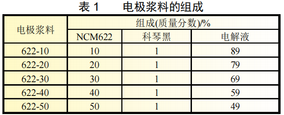调节材料、科琴黑和分散剂的比例,制备出不同配比的浆料,如表1所示。表1中质量分数为10%~50%的电极浆料标记为622-x,以此标记不同配比的电极浆料及其电池。