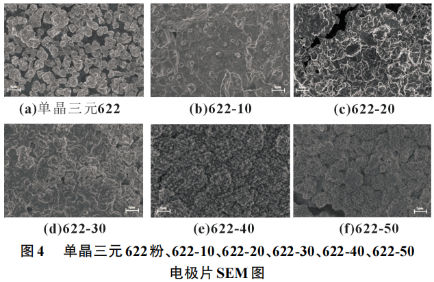 本文观察了单晶结构三元622粉、622-10、622-20、622-30、622-40、622-50 电极片表面形貌,如图4所示。