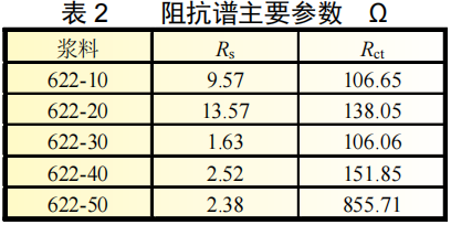 图5给出了622-10至622-50五组不同活性颗粒质量比的浆料体系的电化学阻抗谱(EIS)测试曲线。
