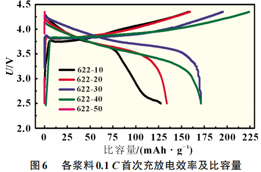 图6所示为各浆料在0.1C时的首次充放电效率及比容量。由图6可知,622-10至622-50首次充放电效率分别是80.88%、84.01%、88.15%、76.51%、16.21%,622-30具有最高的首次充放电效率。