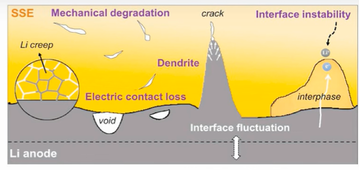 固-固界面易受弹性模量不匹配、热膨胀差异和电极体积变化的影响。锂或硅电极的镀覆/剥离引起大的体积波动,导致界面接触失效。