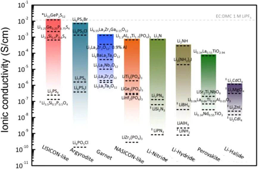 固态电解质包括聚合物、氧化物和硫化物等类型,各自的离子导电率存在较大差异: