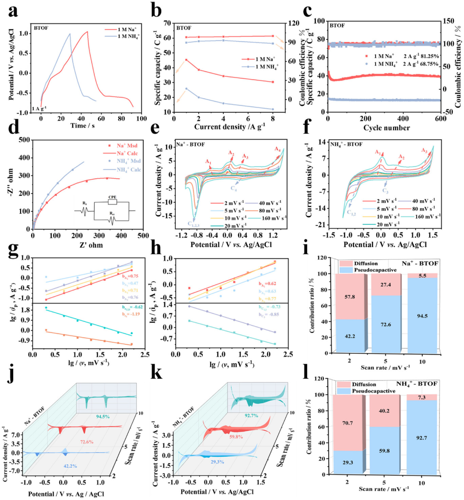 BTOF在1mNa2SO4和(NH4)2SO4中的性能:a)GCD曲线比较,b)比容量和库仑效率,c)循环性能,d)活化奈奎斯特图,e,f)不同扫描速率下的CV曲线,g,h)lgi-lgv曲线,i,l)2、5和10mVs−1扫描速率下赝电容和扩散控制过程的百分比贡献,以及j,k)2、5和10mVs−1扫描速率下的赝电容和扩散控制贡献。