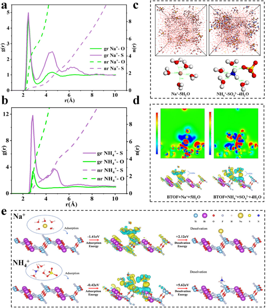 图3. BTOF在1MNa2SO4和(NH4)2SO4中:a,b)RDF曲线,c)MD模拟图和溶剂化结构模型,d)差分电荷密度图,以及e)界面模拟图。