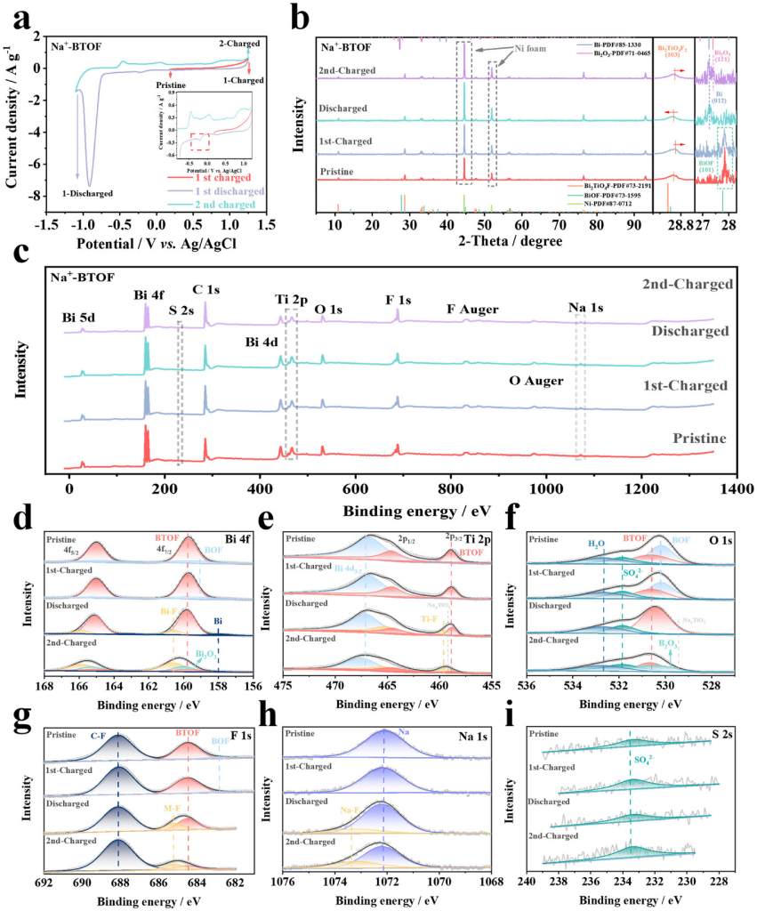 图4.a)非原位测试样品的典型CV图像,BTOF电极在四个不同的电位点:b)非原位XRD图谱,c)全光谱扫描,d)Bi4f,e)Ti2p,f)O1s,g)F1s,h)Na1s,以及i)S2s的BTOF。