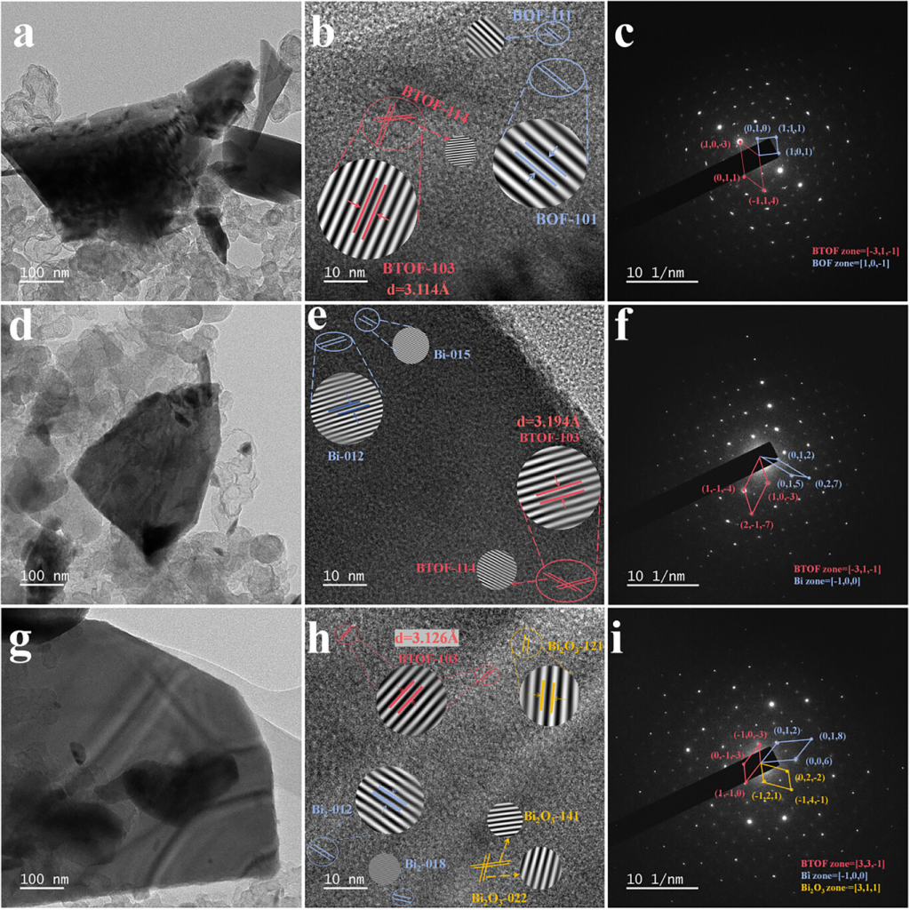 图5.在10mVs−1的CV循环的前三个段落中,BTOF电极在指定的特定充放电状态下的非原位TEM、HRTEM和SAED图像:a–c)开路电压充电至1.25V状态,d–f)放电至-1.1V状态,g–i)充电至1.25V状态。