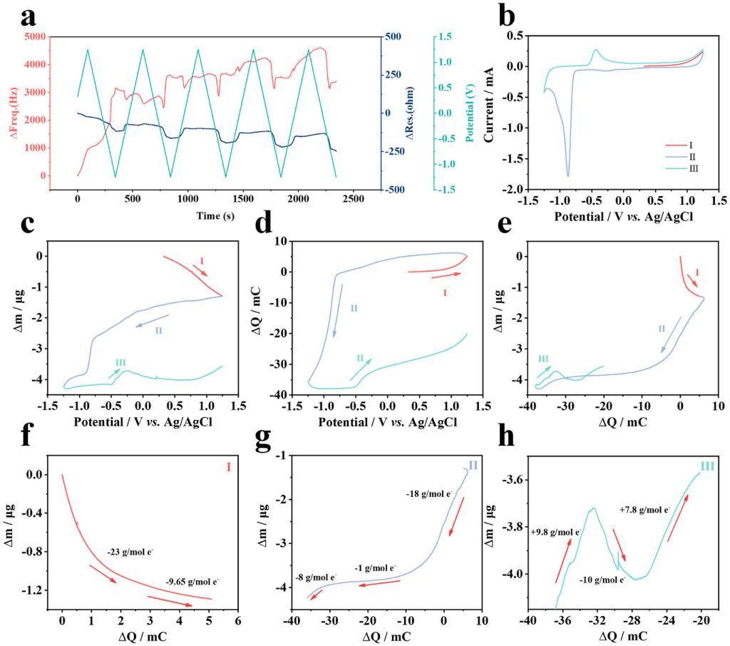 图6. 使用原位电化学石英晶体微天平(EQCM)对1mNa2SO4电解液中的BTOF电极进行表征:a)原始EQCM频率数据,b)扫描速率为10mVs−1的前三个连续循环伏安(CV)循环,c)Δm曲线,d)ΔQ曲线,e)Δm和ΔQ之间的关系曲线;(e)各阶段对应的放大图:f)第一阶段:从开路电压到1.25V的首次充电,g)第二阶段:从1.25V到-1.25V的首次完全放电,h)第三阶段:从-1.25V到1.25V的第二次完全充电。