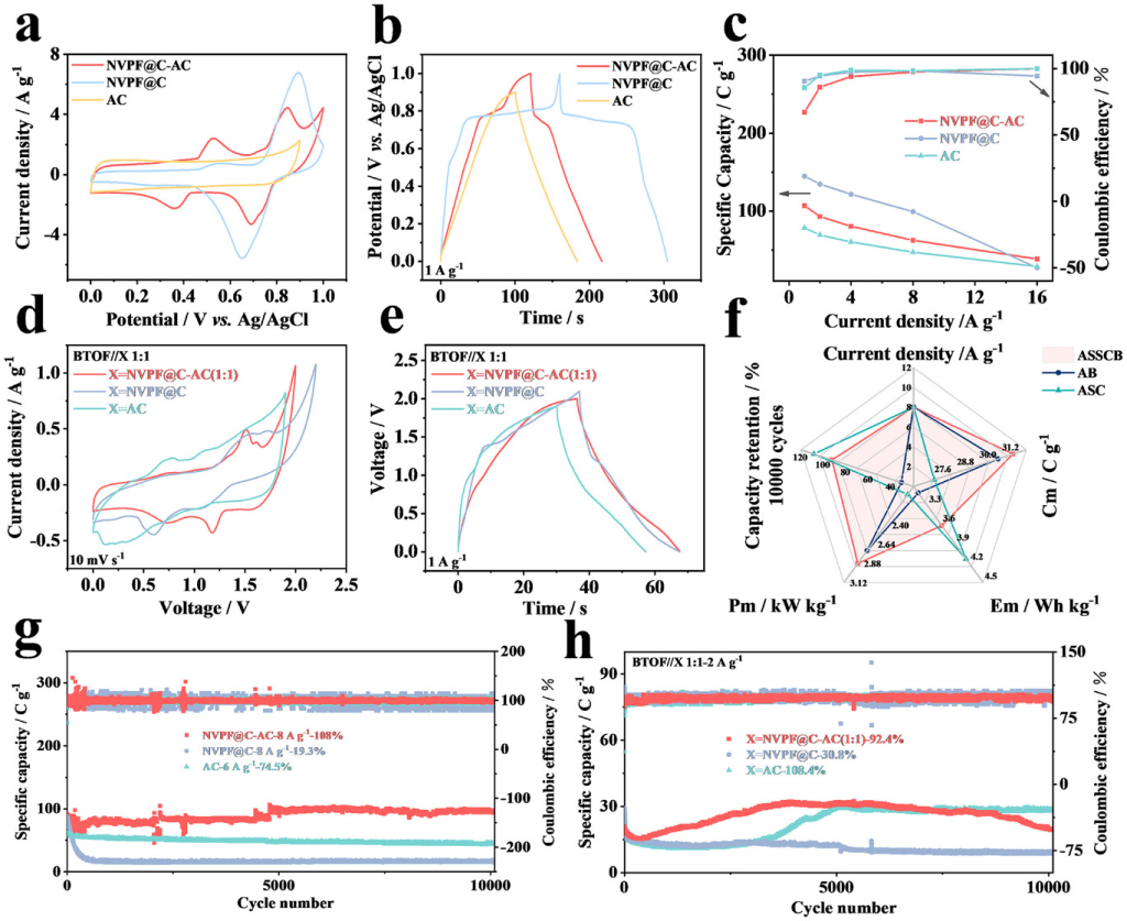 图7.在1M硫酸钠水溶液中,对单电极AC、NVPF@C和NVPF@C-AC进行测试:a)比较扫描速率为30mVs⁻¹时的循环伏安曲线;b)比较电流密度为1Ag⁻¹时的恒电流充放电曲线;c)比较比值图(包括库仑效率)。三种器件结构(BTOF//AC、BTOF//NVPF@C和BTOF//NVPF@C-AC):d)比较扫描速率为10mVs⁻¹时的循环伏安曲线;e)比较电流密度为1Ag⁻¹时的恒电流充放电曲线;f)各种电化学性能参数的雷达图;g,h)循环性能曲线。