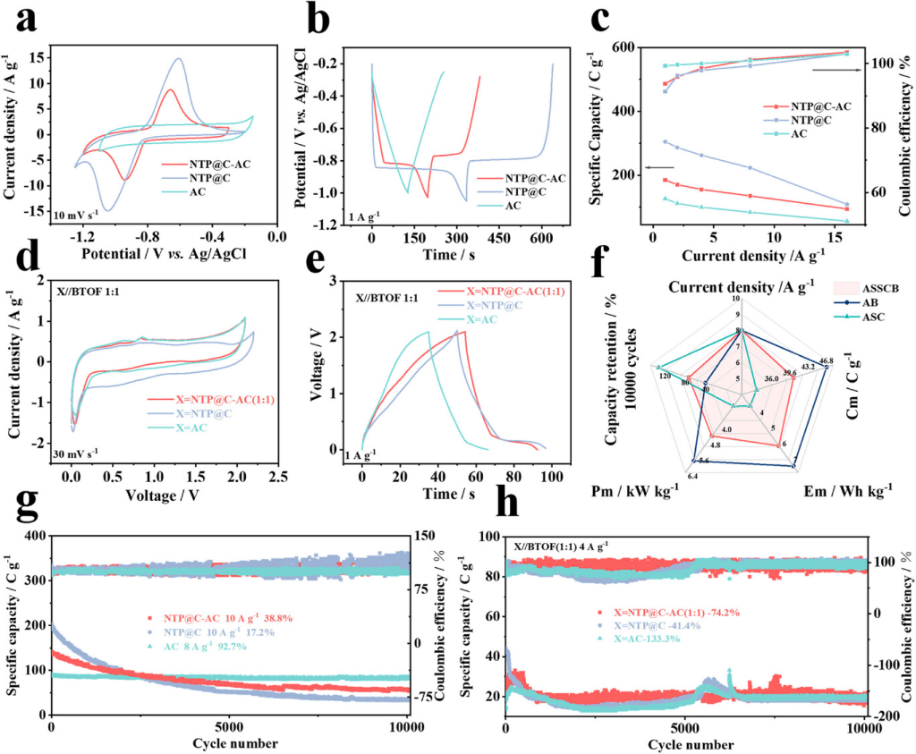 图8. 单电极NTP@C-AC、NTP@C、AC在1M硫酸钠水溶液中的性能:a)扫描速率为10mVs⁻¹时的循环伏安曲线对比;b)电流密度为1Ag⁻¹时的恒电流充放电曲线对比;c)对比比值图(包括库仑效率)。三种器件结构(BTOF//AC、BTOF//NVPF@C、BTOF//NVPF@C-AC):d)扫描速率为30mVs⁻¹时的循环伏安曲线对比;e)电流密度为1Ag⁻¹时的恒电流充放电曲线对比;f)各种电化学性能参数的雷达图;g、h)循环性能曲线。