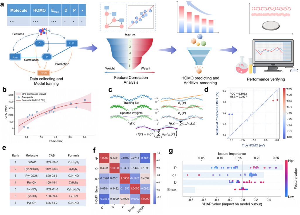 图1. 定量结构-性能关系阐明。a)机器学习驱动的电解液添加剂筛选示意图。b)HOMO与累积电镀容量之间的二次多项式拟合。c)AdaBoost训练过程示意图和d)相应的预测性能。e)测试集中按预测HOMO能量(从高到低)排序的分子。f)不同特征之间的皮尔逊相关系数。g)特征重要性的SHAP值分析.