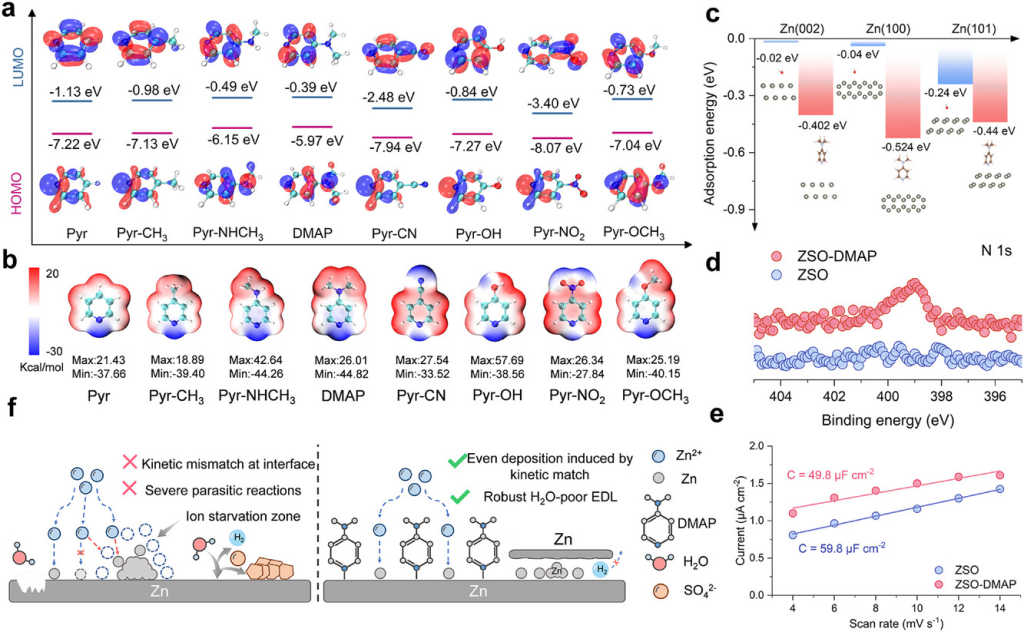 图2. 最佳电解液添加剂的预测和表征。a)前线轨道能级和b)具有不同功能团的吡啶衍生物的静电势分布。c)H2O和DMAP在Zn晶面上的吸附能。d)在ZSO和ZSO-DMAP电解液中浸泡72小时后的Zn箔的高分辨率N1sXPS。e)ZSO和ZSO-DMAP电解液中Zn电极的双电层电容。f)DMAP吸附赋予的整体动力学平衡示意图。