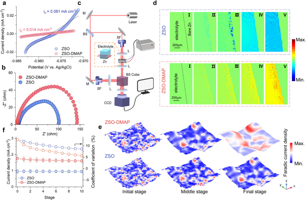 图3. 优先吸附使Zn/电解液界面达到动力学平衡。a)ZSO和ZSO-DMAP电解液中Zn电极的交换电流密度。b)不同电解液中Zn|Zn对称电池的电化学阻抗谱曲线。c)原位EDH表征示意图。d)不同电解液中不同沉积时间的Zn/电解液界面原位EDH曲线。e)不同电解液中Zn负极表面(100×100μm2)电场分布的有限元模拟。f)在不同电解液中电沉积过程中Zn负极电流密度均匀性的变化。
