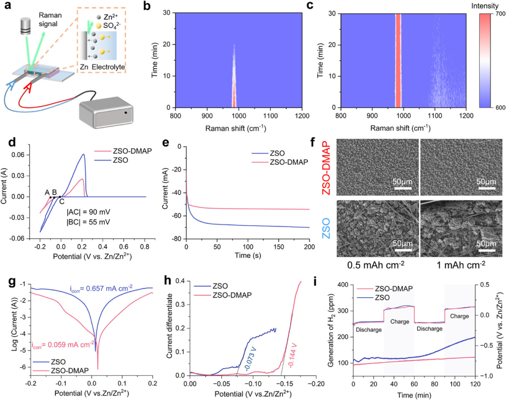 图4. DMAP调控的Zn负极的电化学和界面稳定性。a)原位拉曼表征示意图。b)ZSO和c)ZSO-DMAP电解液中电沉积过程中电极/电解质界面的原位拉曼光谱。d)不同电解液中Zn|Cu电池的循环伏安曲线。e)不同电解液中Zn|Zn对称电池的计时电流曲线。f)ZSO和ZSO-DMAP中Cu基底上Zn电沉积的SEM图。g)Tafel图和h)不同电解液中的差分LSV曲线。i)在不同电解液中电镀/剥离过程中的原位差分电化学质谱测试。